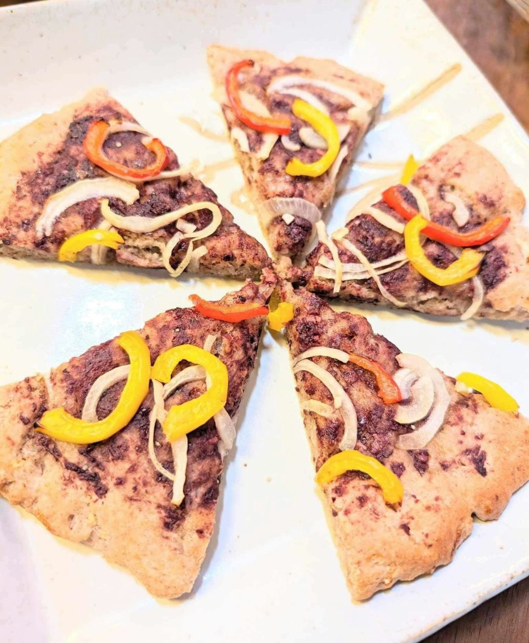 レシピは【つぶつぶ雑穀パンレッスン 株式会社ビオ・マガジン P56】に掲載 ピザパン ※ソースにオリーブをペースト状にしたものを使っています。